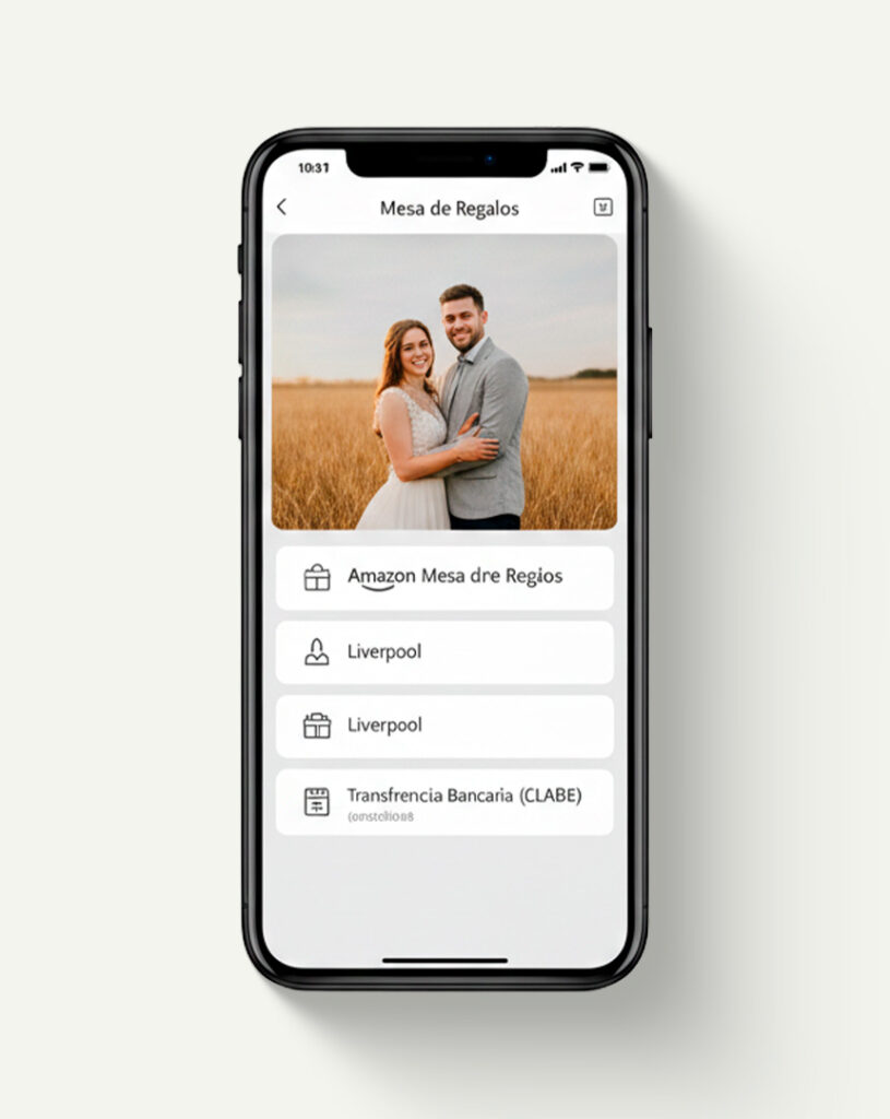 Tu mesa de regalos a un clic. Integra enlaces de Amazon, Liverpool o datos bancarios para facilitar el regalo a tus invitados.